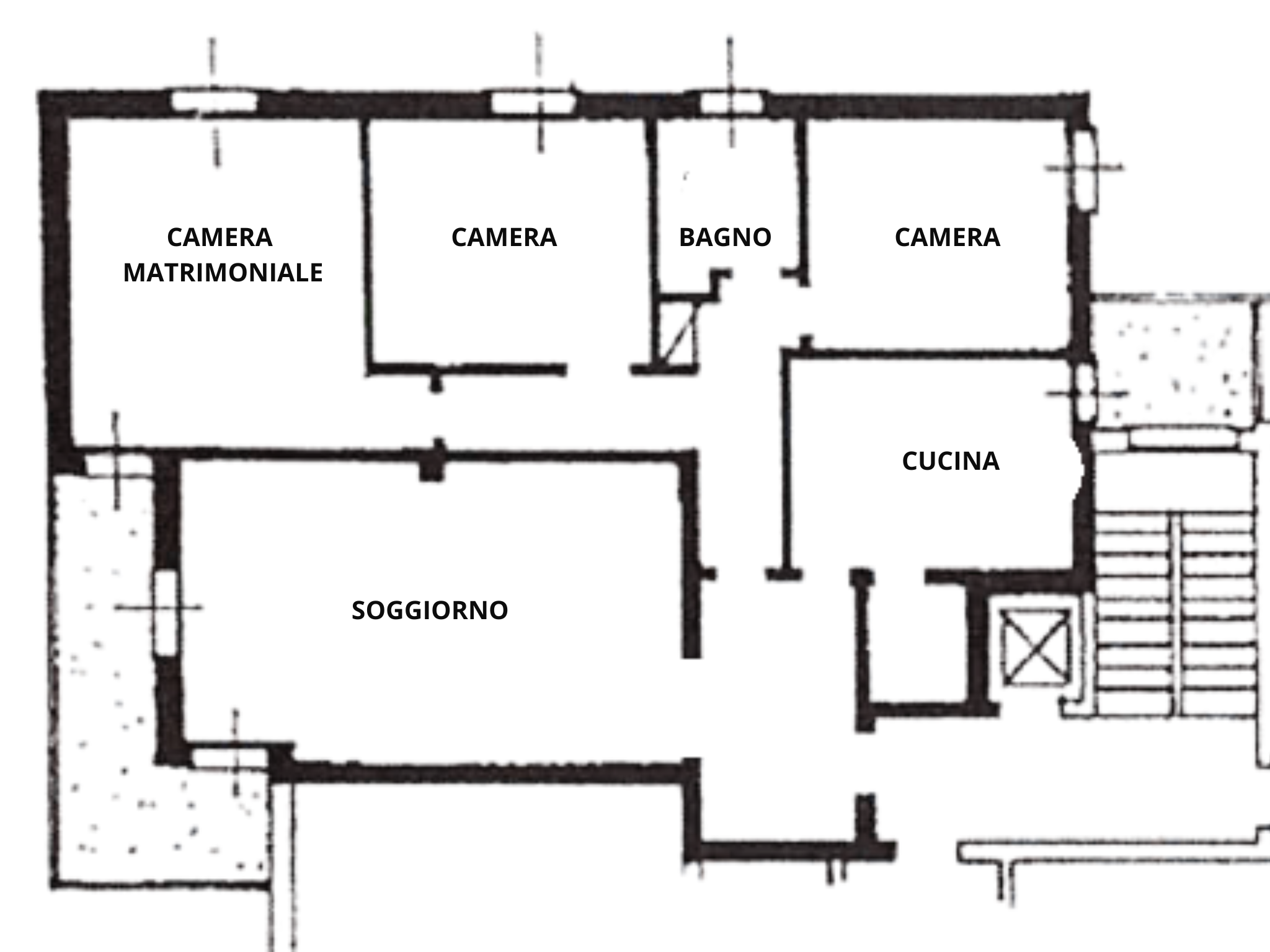 L’appartamento, posto al primo piano e servito da ascensore, è così composto: ingresso, zona giorno con luminoso soggiorno, che si affaccia su uno splendido terrazzo angolare, una cucina abitabile con balcone di servizio. La zona notte ospita tre ampie camere da letto di cui una matrimoniale con balcone e un bagno finestrato.